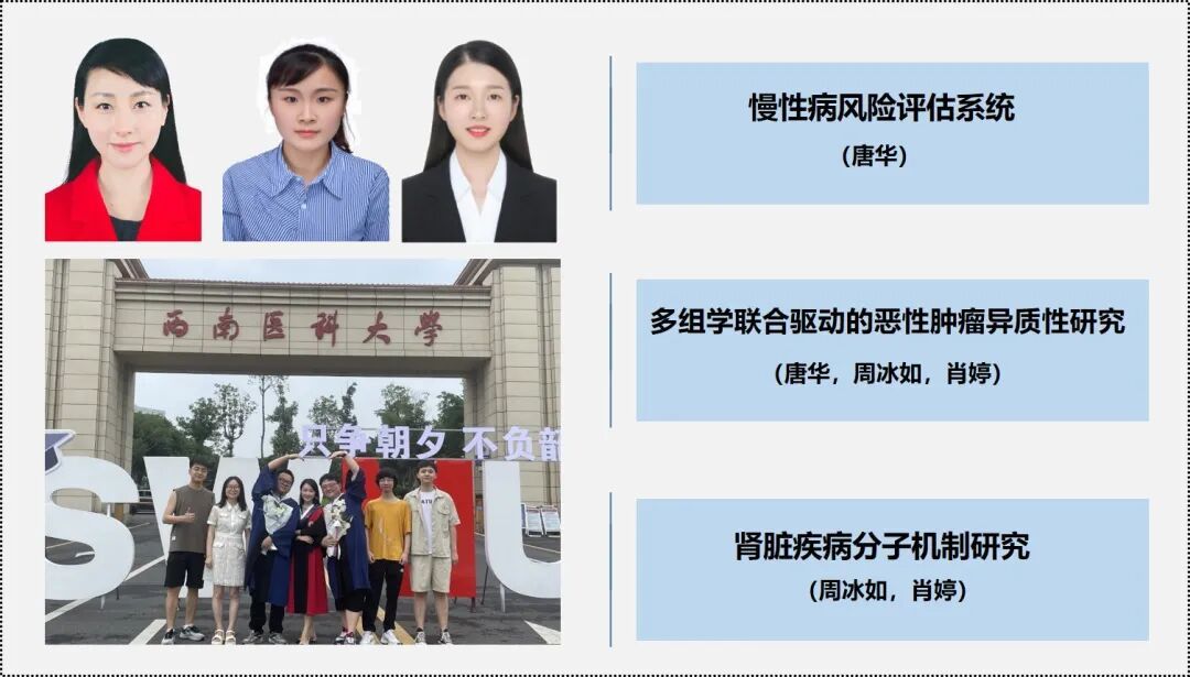 团队主要从事慢性病生物信息学和分子生物学研究,目前已形成三个研究方向:多组学联合驱动的恶性肿瘤异质性研究,慢性病风险评估系统,肾脏疾病分子机制研究。