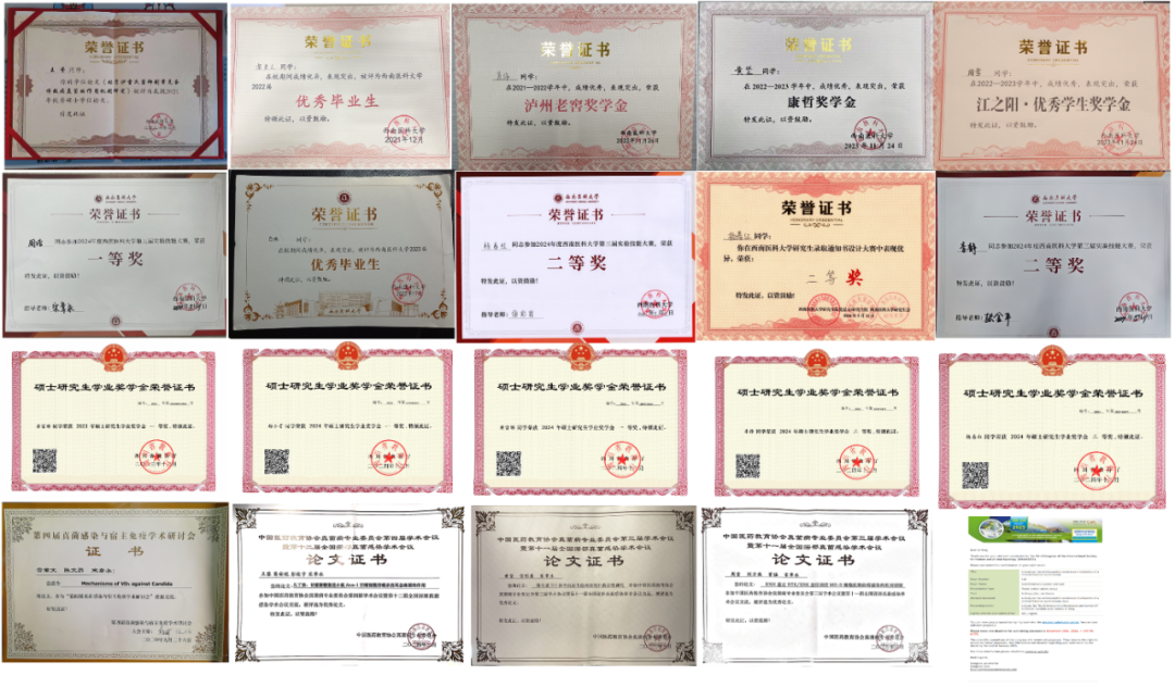 团队已累计培养(毕业)硕士研究生16名;目前在读硕士研究生16名。在团队全体师生的共同努力下,指导的研究生获国家奖学金、泸州老窖奖学金、江之阳·优秀学生奖学金、校级优秀硕士研究生、研究生学业一等奖学金等荣誉和奖励20余人次。指导和资助研究生不定期的参加国内外学术活动,鼓励学生在学术活动中积极开展学术交流,20余人次在亚太医学真菌学会议、真菌病专业委员会学术会议、真菌感染与宿主免疫学术研讨会、西南医科大学壁报大赛等学术会议中汇报交流。