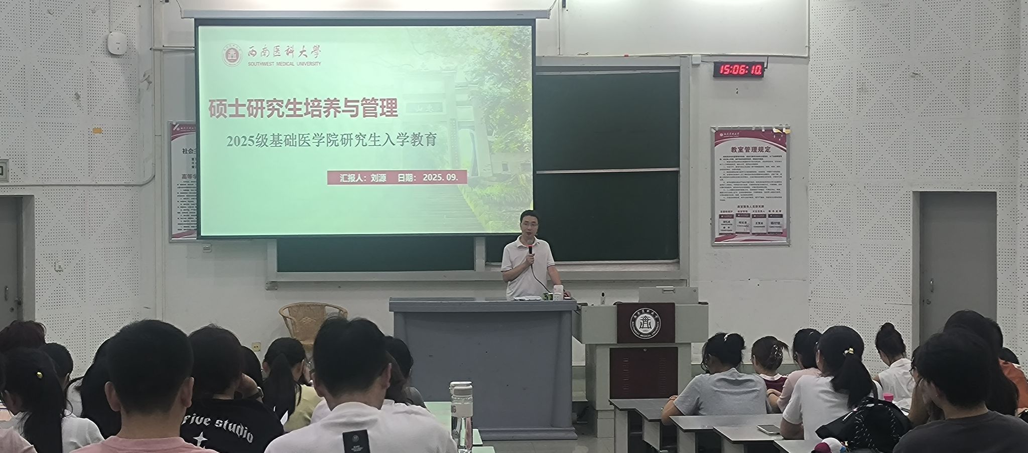 基础医学院院长谭晓秋以“学术诚信:科研生命的基石”为主题,结合典型案例强调学术道德的重要性,叮嘱同学们以严谨态度追求真理。随后,辅导员刘源详细解读了研究生培养方案、实验室安全规范及学位授予细则,帮助新生明确学习目标与成长路径。