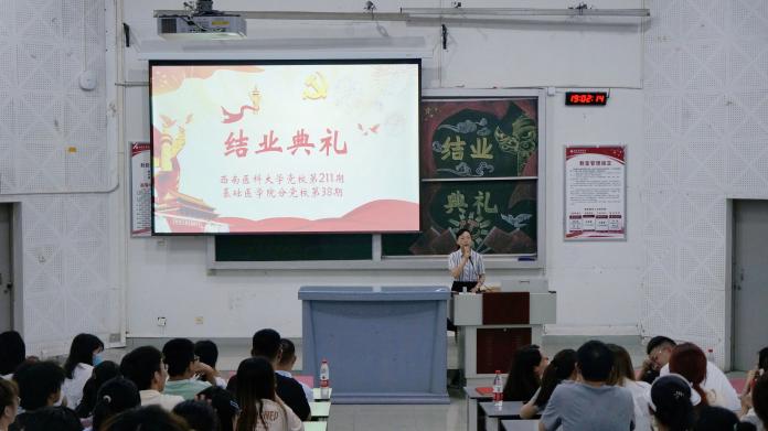 2024年5月28日晚上18:30西南医科大学第220期(暨基础医学院分党校第39期)入党积极分子培训班结业典礼在鸿文楼301教室隆重举行。出席本次典礼的领导有基础医学院党委书记、分党校校长阳静,基础医学院党委委员、副院长涂江义,药学院党委书记唐艳斌,体育学院副书记何红媛。本次典礼由基础医学院党委副书记兼分党校副校长黄钰主持。