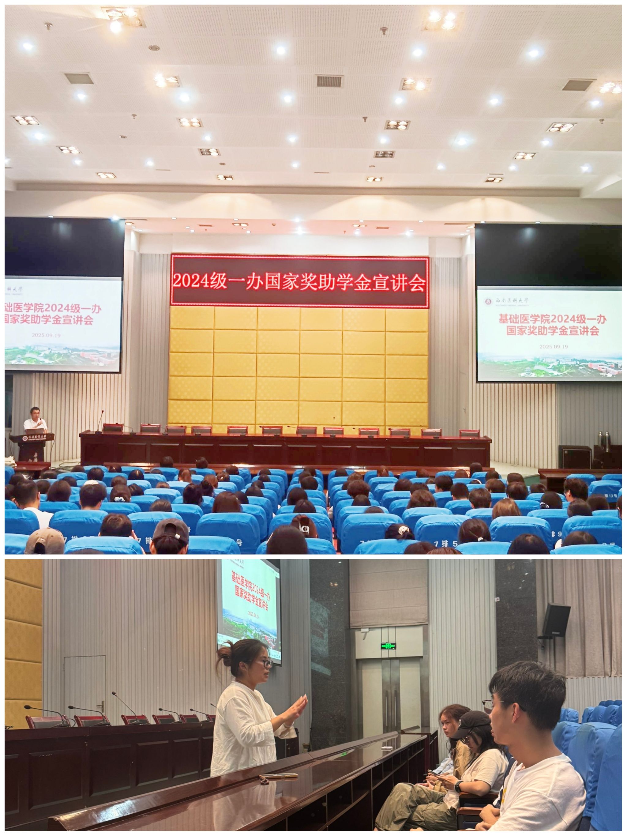为帮助同学们全面了解国家奖助学金相关政策,明晰申请流程与评审要求,9月19日晚,基础医学院2024级一办在城北校区第二学术报告厅组织召开了2025年国家奖助学金政策宣讲会。学校资助中心工作人员赵军祥、年办辅导员龙菲、生活部全体成员以及各班学生代表参会。