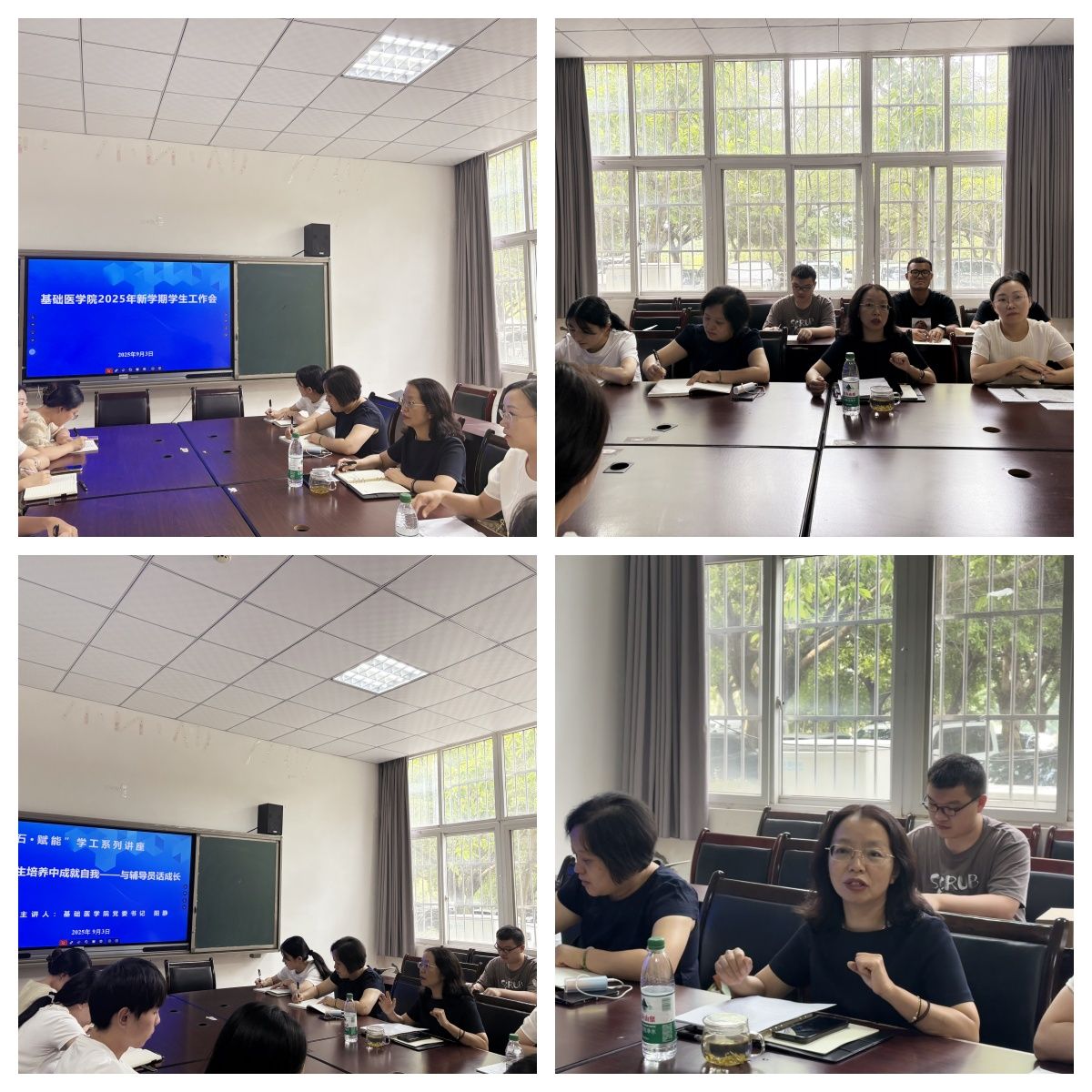 9月3日下午,基础医学院在鸿文楼1-7会议室召开2025年秋季新学期学生工作会,全面部署新学期学生工作,进一步加强辅导员队伍建设。学院党委书记阳静、党委副书记兼纪委书记黄钰,各学工办专兼职辅导员及辅导员助理参加会议。