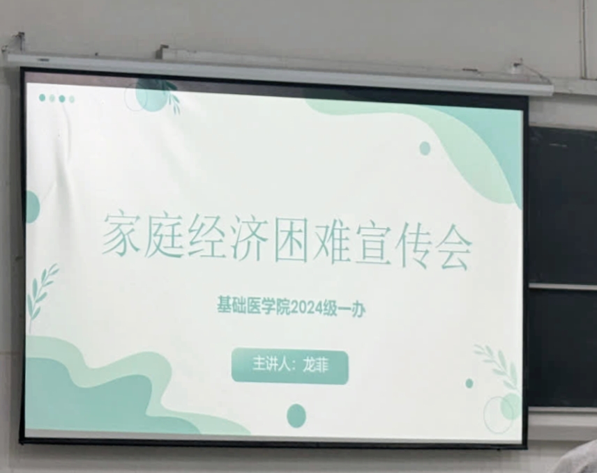 9月3日中午,基础医学院2024级一办在鸿文楼205教室召开2025-2026学年家庭困难学生认定工作宣讲会。本次宣讲会由2024级一办辅导员龙菲主讲,各班生活委员、班长及团支书共同参加,旨在系统传达家庭经济困难学生认定工作的政策要点与流程规范,为后续班级认定工作的有序推进奠定基础。