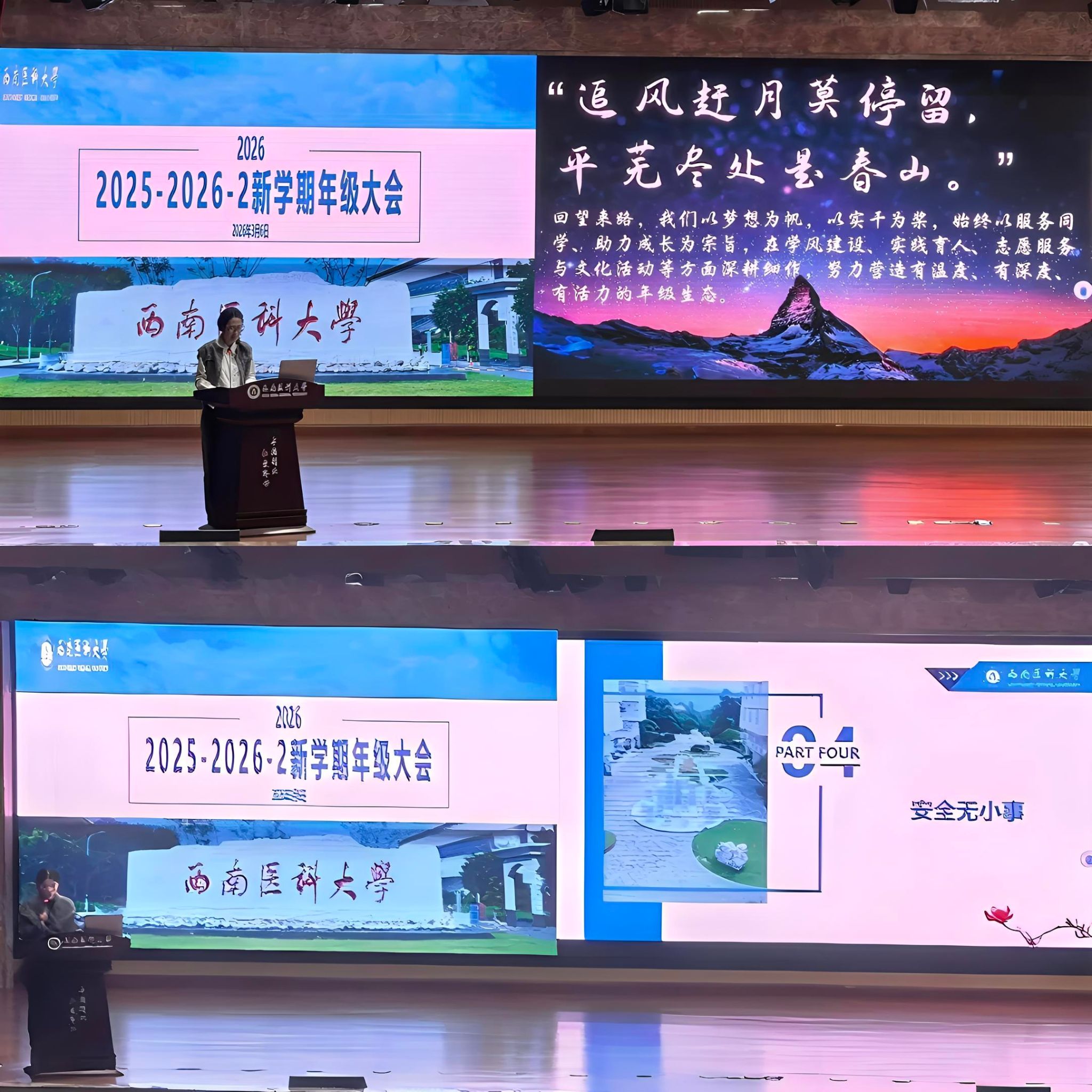 随后,陈然全面分析了上学期各专业的学业数据,在充分肯定同学们取得进步的同时,也客观指出了当前存在的差距与不足。她勉励大家在新学期找准定位、主动作为,并围绕“大二下学期关键任务”,从学业规划、能力提升、安全纪律和身心健康四个方面提出具体建议。她强调,大二是学业进阶、能力提升的重要阶段,希望同学们珍惜时光、奋发进取。最后,她祝愿全体同学新学期学业进步、平安顺遂。