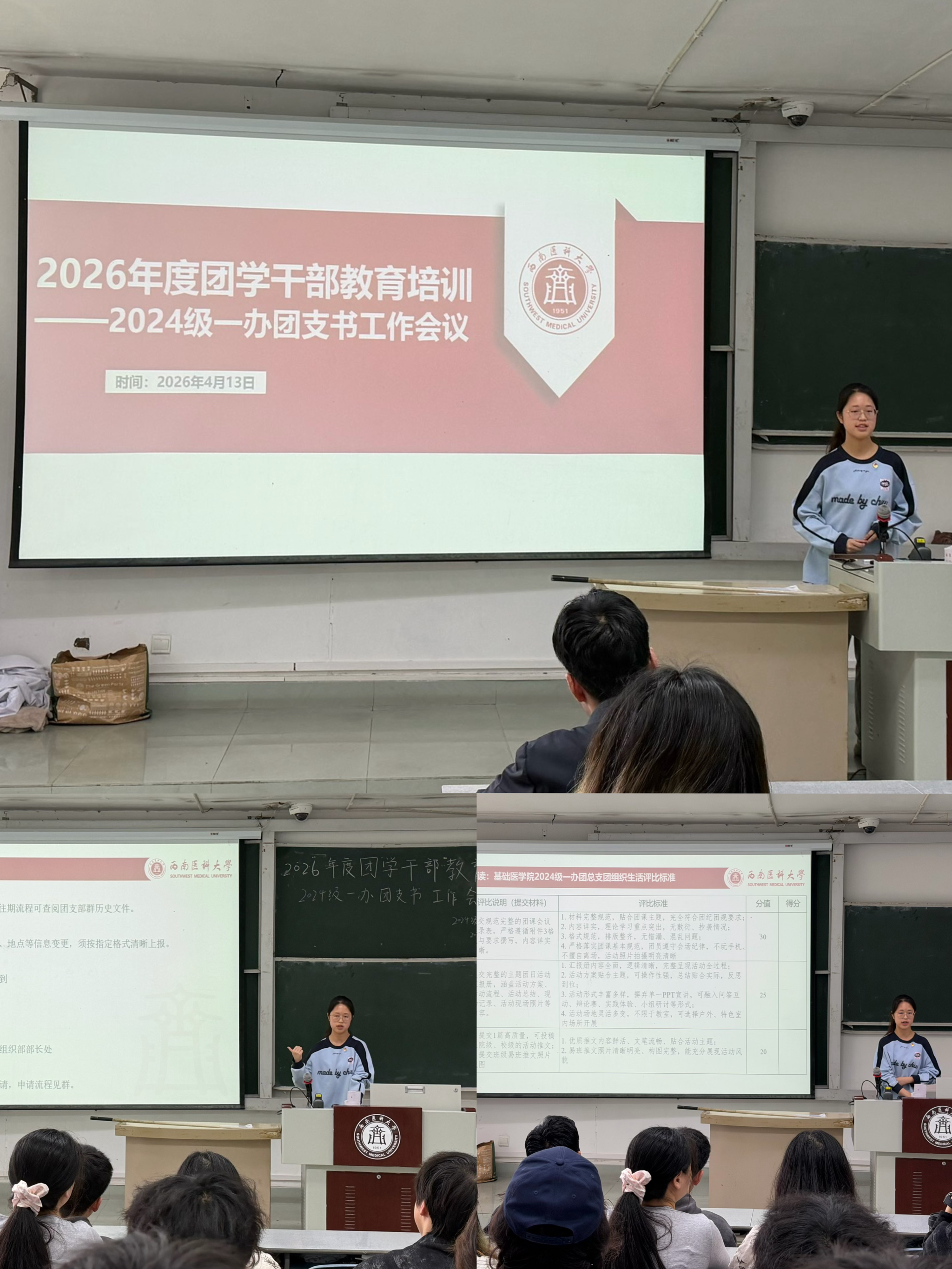 为进一步提升团课与团组织生活质量,推进基层团支部标准化、特色化建设,4月13日,基础医学院2024级一办团总支在鸿文楼201教室召开2026年度团学干部教育培训暨团支书工作会议,专题部署“2026年4月团组织生活评比活动”。2024级一办党支部书记陈然、团总支书记田艳、团总支副书记余甜瑶及全体团支书参会。