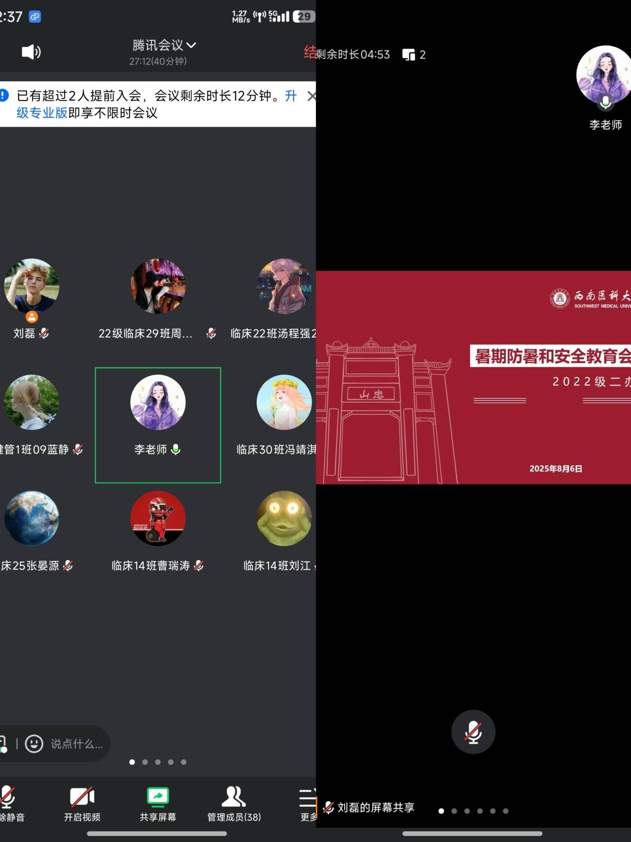 为持续做好暑假期间各项工作,加强班团建设,8月6日,临床医学院2022级二办召开线上暑期安全教育班团例会,会议由辅导员李蕾主讲,各班班长、团支书40余人参加。