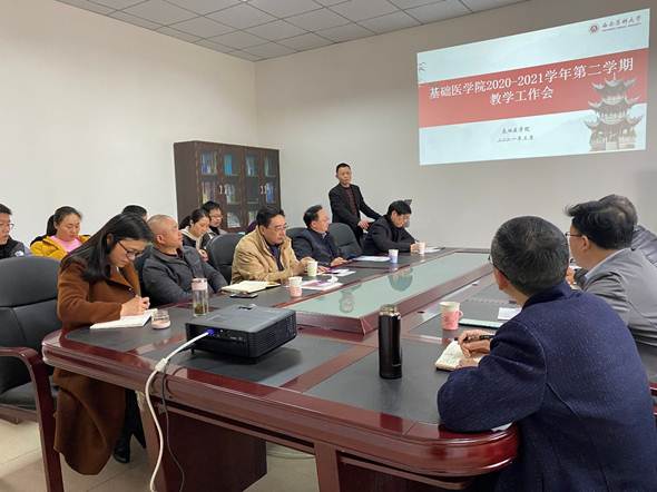 会上,基础医学院副院长涂江义对本学期基础医学院近期需要开展的工作和常规教学工作任务进行布置安排,要求各教研室、实验室必须要保质保量完成专科生、成教生、本科生、留学生和研究生五个教学层次的教学工作任务,确保教学差错事故零发生。同时也从师德师风、师资培养、课程建设、教材建设、题库建设、教育教学改革、实习教学项目研究、实验室安全、教学督导、教学评价(含同行评价)、教学资料归档、教研室和实验室的年度工作计划等方面提出了明确要求。最后,对各教研室、实验室、教务科提出了本学期重要工作计划:1.拟成立PBL团队、课程思政团队、信息化建设团队、双创科研团队、教育教学改革创新团队、教学督导团队等,充分发挥团队优势,以便做好引领示范和推广;2.加强原有校级、省级、国家级一流课程建设,对标对点梳理,积极筹备并申报第三批次5类金课、积极建设和申报省级、国家级实验教学示范中心、虚拟仿真实验教学中心或实验项目;3.坚持以赛促教,以赛促提高,积极组织学生、教师参加各级各类教学技能大赛。希望