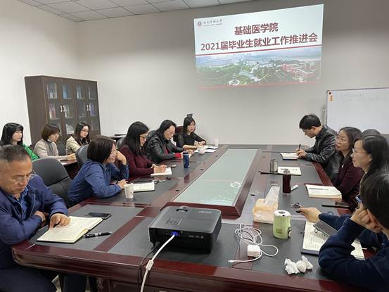 为促进2018级临床医学定向专科毕业生全面高效就业,2021年3月19日上午,基础医学院在鸿文楼一楼小会议室召开2021届毕业生就业工作推进会。基础医学院领导班子、就业工作帮扶教师以及毕业年级辅导员参加了会议。会议由基础医学办副主任王旭利主持。