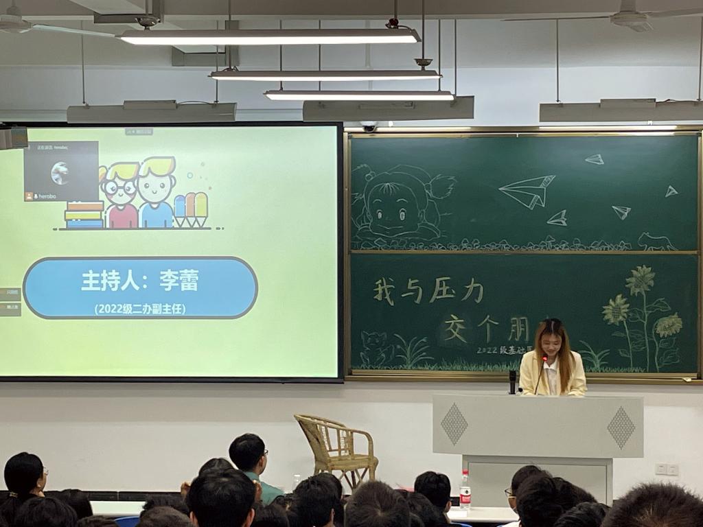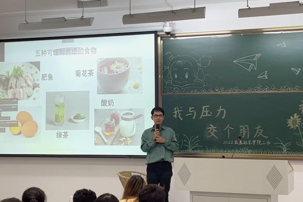 为提高同学们应对压力,宣传普及心理健康知识,让同学们在初入大学之际正确认识学习和生活中存在的问题与压力,学会如何疏导情绪,提高个人心理素质,10月25日,2022级二办邀请西南医科大学应用心理学教研室副主任汪枭在学海楼开展“我与压力交个朋友”为主题的线上线下心理讲座。参与本次讲座的有基础医学院2022级二办副主任李蕾、2022级二办新生和基础医学办新生,共计320人。讲座由李蕾主持。