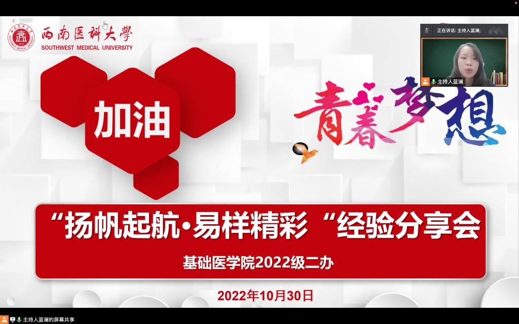 朝气蓬勃的新生初入大学校园,在充满憧憬和想象的同时,内心又怀揣着疑惑和困扰。为提高同学们学习能力,打造精英医学人才,2022级二办决定为同学们开展二期学习经验交流系列讲座。10月30日晚19点第一期讲座如期进行,此次活动特邀请到2017级临床专业毕业的优秀学姐学长分享学习生活干部经验与心得体会,主讲的有北京大学医学院部研究生在读吴辰晨、广州医科大学研究生在读毛嶬苗、四川大学华西医学院研究生在读杨洋,参会的有基础医学院副2022级二办副主任李蕾、2022级二办新生,共计250余人。会议由学习部部长蓝澜主持。