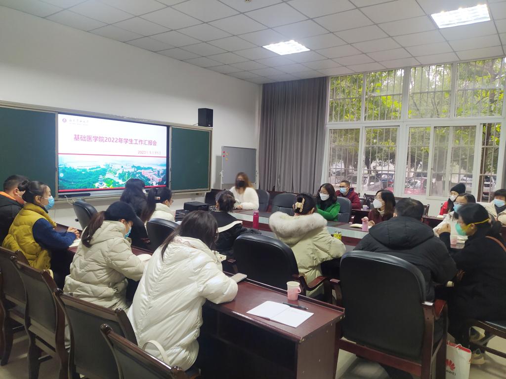 2023年1月11日上午,基础医学院在鸿文楼小会议室召开2022年学生工作汇报会,基础医学院党委书记阳静、全体专兼职辅导员、辅导员助理参加会议,会议由基础医学院党委副书记、纪委书记黄钰主持。
